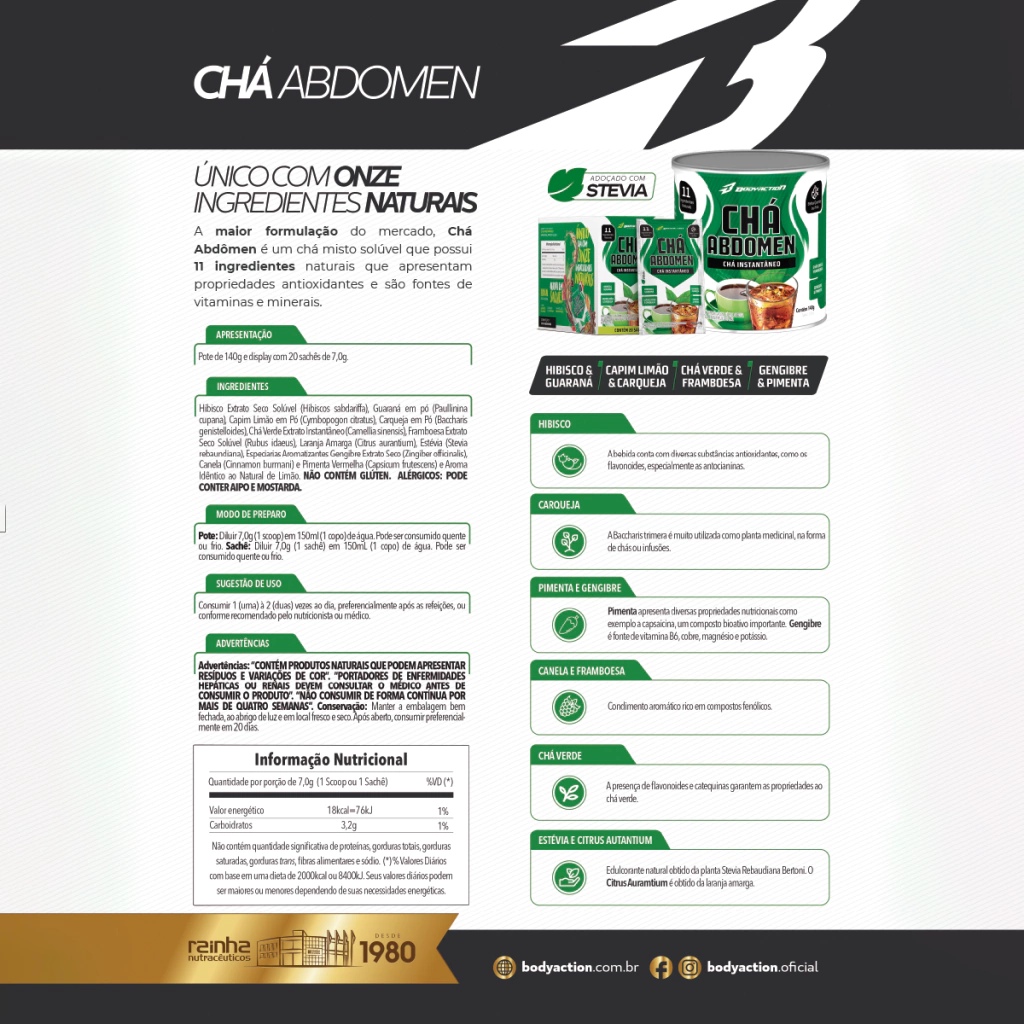 O Chá Abdomen 140g da Bodyaction é um chá misto solúvel que contém 11 ingredientes naturais. Esses ingredientes ajudam a combater a retenção de líquidos e promovem uma sensação de leveza e bem-estar.