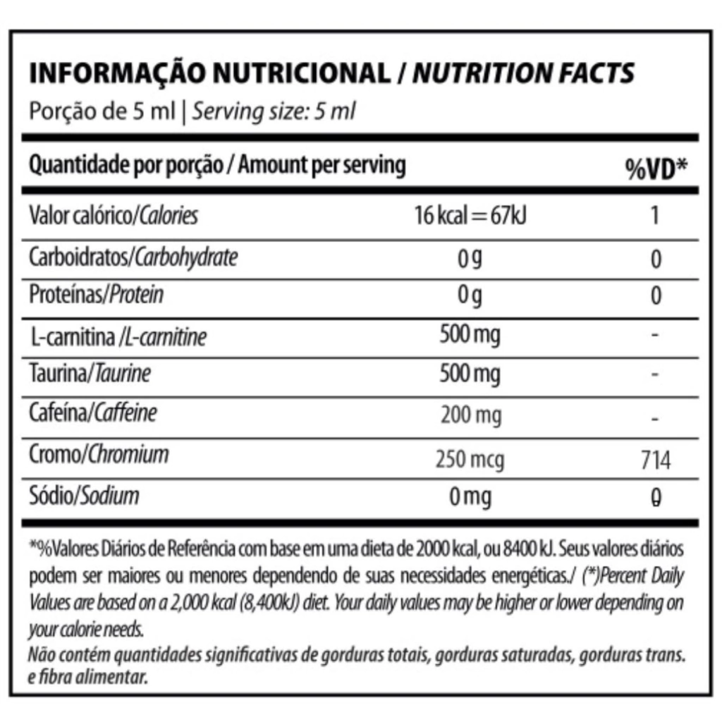 - Água filtrada, L-carnitina,Taurina, Cafeína, Picolinato de Cromo, Aromatizante Gengibre em Pó, Extrato de Pimenta Preta, Aroma Idêntico ao natural de Maçã Verde , Conservantes Sorbato de Potássio, Benzoato de Sódio e Edulcorante Sucralose.
