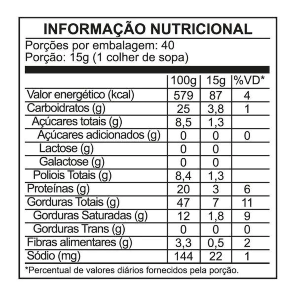 - Pode conter avelã, macadâmia, nozes, pistache, castanha de caju e castanha do Pará.