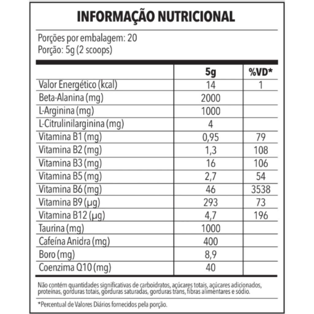 - Beta-Alanina, Taurina, Arginina (L-Arginina), Cafeína Anidra, Isomaltulose, Coenzima Q10, Vitamina B6 (Cloridrato de Piridoxina), Boro