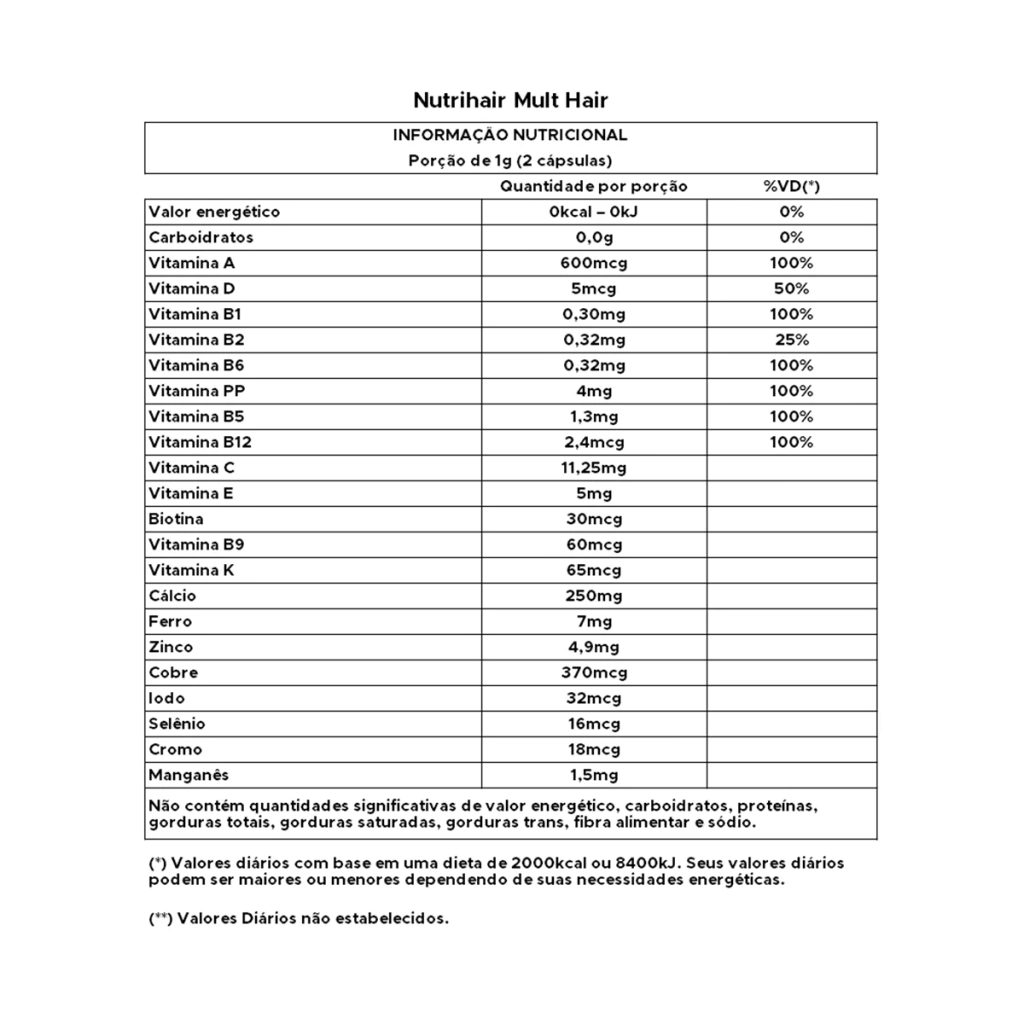 O Nutrihair 60 Cápsulas da Nutrivale é um suplemento voltado para a saúde de cabelos e unhas. Sua fórmula é rica em vitaminas e minerais que ajudam a fortalecer os fios e as unhas, prevenindo a quebra e o enfraquecimento.